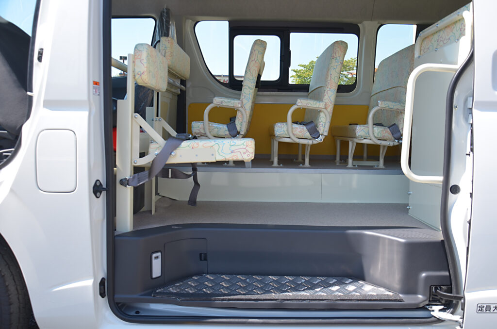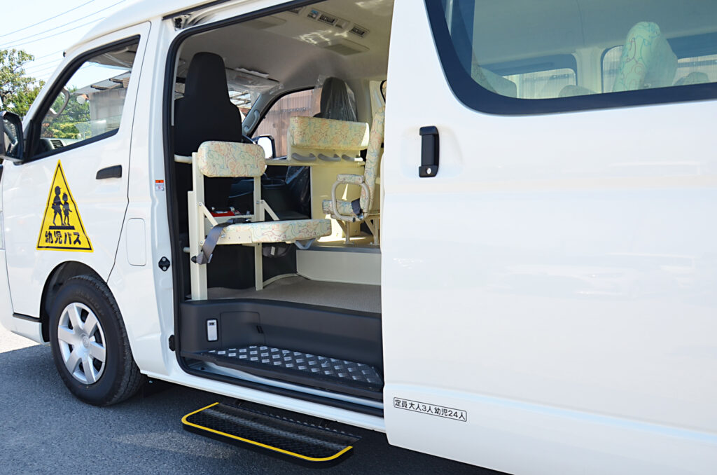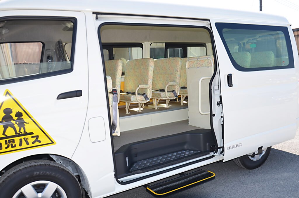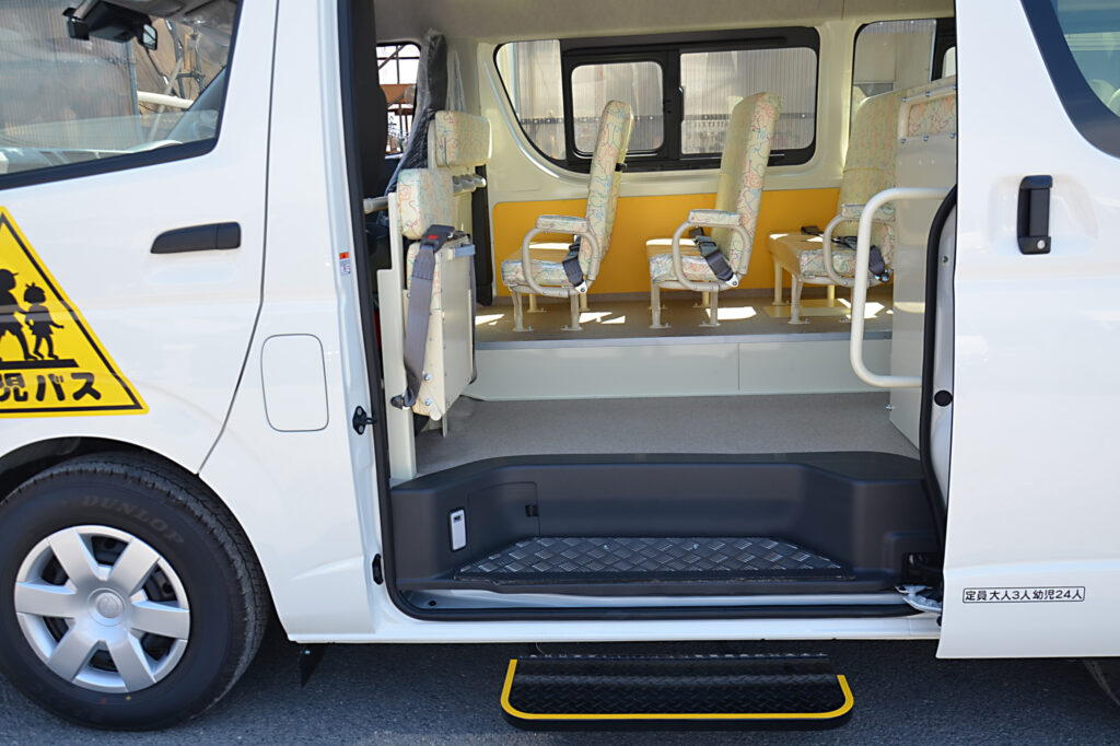 小・中型市販幼児バスの乗降口にはパワースライドドアの設定はございません。(マイクロ幼児バスのオプション装備は除く) その理由は、送迎時の乗降口の開閉は原則、引率者が「周囲や乗降時の安全確認を行った上で行う事」と考えられている為となります。